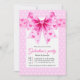 Pink coquette bow with hearts Galentine's Valentine's Day party invitation. It features a large pink bow with magenta hearts on it. There is a wide pink border around it with white hearts. The back features a pattern of white hearts on pink.