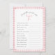Título del juego editable y preguntas de texto para ducha de bebé o ducha de novia. Presenta una proa pintada a mano con marco y respaldo color rosa claro de gingham.