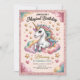 Make your little girl's birthday truly magical with this adorable unicorn-themed party invitation! Featuring a charming unicorn with a rainbow mane sitting on fluffy clouds, surrounded by golden stars and hearts, this design is perfect for celebrating a 4th birthday. With pink glitter borders and whimsical pastel elements, it's sure to delight guests and set the tone for a fun, fantasy-filled party.
