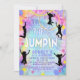 Pink Purple Tie Dye Lets Get Fiesta Jumpin Birthday Invitation Estilo retro dulce azul, rosa y morado saltemos y jueguemos a la invitación de cumpleaños trampolín con un fondo de tintes de corbata y cinco siluetas saltantes negras para niños. Esta invitación de cumpleaños retro trampoline también incluye algunos corazones, estrellas y un encabezado decorativo de tipo de letra.