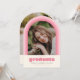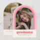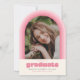 This fun retro inspired graduation announcement features space for a single photo on the front framed by an arch in shades of pink. It also has space for the graduate's name, school, and class year. The back of the announcement has space for a second photo and more text.