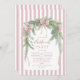 A soft pastel Christmas invitation featuring watercolor pine branches, pinecones, and pink satin bows on a blush striped background. This delicate design blends vintage charm with modern elegance — perfect for cozy holiday gatherings or feminine festive celebrations.