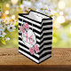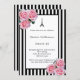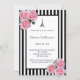 Classic slim black and white stripes as background. With romantic pink roses, and the the Eiffel Tower as decoration. A black and white frame with templates for your party information.