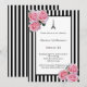 Classic slim black and white stripes as background. With romantic pink roses, and the the Eiffel Tower as decoration. A black and white frame with templates for your party information.