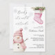 Celebrate your little snowflake’s arrival with this charming “Baby It’s Cold Outside” baby shower invitation, featuring a smiling snowman in a cozy pink hat and scarf, silver snowflakes, and a festive pink stocking with pine greenery.