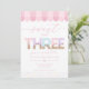 Celebrate your toddler's milestone with this "Sweet to be Three" ice cream parlor birthday invitation. This adorable design features watercolor sprinkle typography, a classic pink awning, and a whimsical sundae aesthetic. Perfect for a summer ice cream social, this cheerful invite is easily personalized to scoop up some fun for your daughter’s third birthday party.