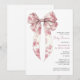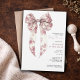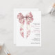 A pink toile coquette ribbon girl baby shower invitation featuring an elegant vintage inspired bow illustration that brings a soft romantic touch to the celebration. The delicate ribbon artwork paired with classic typography creates a graceful look that feels both timeless and stylish for welcoming a baby girl. Inspired by the popular coquette aesthetic and traditional toile motifs, this design carries a gentle heirloom quality that works beautifully for charming baby showers. A lovely choice for hosts planning a baby girl shower, vintage inspired gathering, or sweet pink celebration where feminine elegance and classic storybook style come together. Available in print, as a digital download or both.