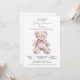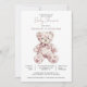 A pink toile teddy bear baby girl baby shower invitation featuring a charming floral patterned teddy illustration and soft dusty rose typography. The toile style bear adds a sweet nursery inspired detail while the clean white background keeps the design light and elegant. The teddy bear illustration sits at the center of the layout, creating a warm and welcoming focal point for a baby girl celebration. A lovely choice for a teddy bear themed baby shower, baby girl shower, or classic nursery inspired gathering. The simple layout keeps the event details easy to read while allowing the artwork to remain the highlight of the invitation. Available in print, as a digital download or both.