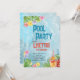 Invitación de cumpleaños Fiesta de piscina con vibración de verano y tipografía peculiar. Diseño acuático con agua fresca azul, rizado enmarcado con cócteles de frutas de verano, flores tropicales, monstera y hojas de palma. Fácil de editar plantilla adecuada para cualquier edad.