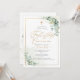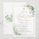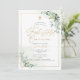 PixDezines Primera Comunión, con exuberante vegetación en acuarela y eucalipto; una cruz dorada falsa, polvo de oro y marco acentuado con lujosa caligrafía. Todos los elementos son editables y removibles.
