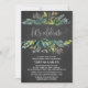 Esta tarjeta de invitación para una fiesta de compromiso con follaje de pizarra que dice "vamos a celebrar" es perfecta para un evento rústico. El diseño presenta un marco de hojas verdes y elementos botánicos de follaje verde en un fondo de pizarra gris carbón. La parte posterior presenta una corona vintage a juego con las palabras "vamos a celebrar" en una hermosa fuente de caligrafía moderna. Esta invitación es perfecta para una fiesta de compromiso, despedida de soltera o cualquier evento o fiesta.