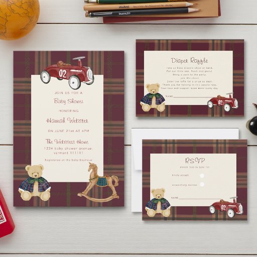Invitación Plaid Teddy Bear Toy Car Baby Shower Invitation