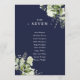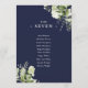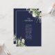 Estos elegantes números de mesa de boda con hojas de vegetación botánica azul marino pueden ser personalizados con el plan de asientos de sus invitados en tipografía chic. Las tarjetas están impresas en el anverso y reverso (a doble cara). Diseñado por Thisisnotme©