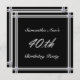 Esta impresionante invitación femenina para una Fiesta de cumpleaños número 40 tiene un fondo negro con bandas de canalizaciones en tonos gris plata metálica. Los emblemas del efecto gemelo de diamante espumoso decoran las esquinas y el texto: 40 en una decoración plateada adorna el centro. Hay otros tamaños y colores disponibles en la tienda.
