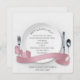 Plato de cena blanco con cubiertos y pancarta de cinta rosa pastel para invitación a cena de aniversario