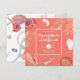 Elegantes invitaciones nupciales con una acuarela de playa con conchas de conchas y corales sobre un fondo naranja al atardecer.