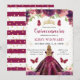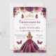 Elegante acuarela princesa de pelo rubio con diseño de color púrpura de ciruela con flores moradas y doradas, mariposas y confeti purpurina de oro.