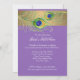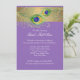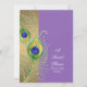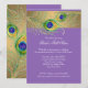 NOTA: Esta es una imagen impresa plana, no hay capas, joyas ni tintas metálicas utilizadas; sin embargo, es una representación gráfica muy realista. PALETA DE COLORES: púrpura lavanda brillante, apariencia de metal dorado bruñido, beige, verde esmeralda, lima, aqua, azul real y púrpura. COLECCIÓN DE DISEÑO: Este es un conjunto completo de productos para bodas, fiestas de compromiso, fiestas para parejas y eventos corporativos formales. El conjunto de invitaciones de boda tiene plumas de pavo real elegantemente giradas que fueron pintadas a mano en acuarela por Audrey Jeanne Roberts. La obra de arte original captura hermosamente la iridiscencia de la pluma en tonos joya brillantes y profundos. Hay joyas gráficamente creadas con apariencia de diamante con un engaste dorado alrededor que se desplazan a lo largo de la curva de las plumas. El fondo es un patrón de metal bruñido y los nombres de los novios, la redacción de la inv