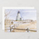 Disfrute de una mañana pálida de invierno en la costa de Massachusetts en esta relajante pintura acuarela de Plymouth Light en invierno. Esta pintura acuarela, que utiliza grises sutiles, amarillos claros y azules fríos, recrea una vista frigiosa de la icónica torre de Gurnet Light desde mediados de invierno. Construido originalmente en 1768, Plymouth Light era uno de los dos faros de Gurnet Point. La torre de la pirámide octogonal pintada fue construida en 1842 después de que las torres anteriores colapsaran. Para capturar este hito histórico en el sol invernal, el artista utiliza sutiles sombras en gris y azul, resaltando artísticamente la arquitectura única de la estructura. Los rojos, azules y verdes brillantes contrastan brillantemente con el paisaje invernal empobrecido por el sol, mientras que las ramas esqueléticas y los postes de vallas sombreadas en primer plano ofrecen una vista única de la bahía de Plymouth.
