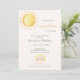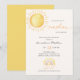 Invitación temática de ducha de bebé soleada con sol acuarela amarillo brillante y arcoiris.