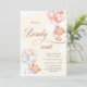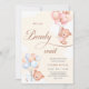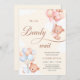 Un género de bebés con temática de oso de peluche revela la invitación a la fiesta. El elegante texto de la tipografía marrón dice 'podemos esperar rápidamente', sobre un fondo salpicado de color azul y rosa con osos de peluche flotando con globos azules y rosas.
