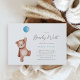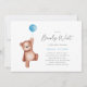 Una invitación a la ducha de bebé con un oso de peluche y un globo azul para un niño. Elementos coincidentes disponibles en la colección Temática de Baby Shower de Teddy Bear.