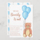 La invitación a la ducha de bebé de este niño está decorada con un lindo oso de peluche y globos azules. El texto marrón dice "Podemos esperar temprano" en una tipografía de escritura elegante. Personalizable fácil. Acuarela original © Michele Davies.