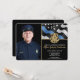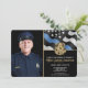 This design features a police force flag with black and white stripes, and a thin blue line stripe as well. The police badge and gold text sits above all of the party details for the retiring law enforcement officer, sheriff, captain, or chief. Customize further with a photo of the new retiree.