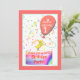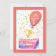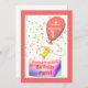 Invitación a una fiesta de cumpleaños con mi imagen de una linda gallina sosteniendo un globo brillante rodeado de confeti.