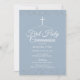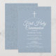 Elegante invitación de primera comunión que incluye delicado polvo de estrellas plateado, personalizable con información especial en texto elegante sobre fondo azul polvo. Diseñado por Thisisnotme©
