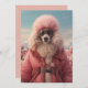 Imagen divertida de un King Poodle en el Polo Norte con un cálido abrigo rosa y esponjoso abrigo y gafas de nieve.