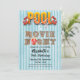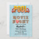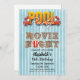 Make a splash with this fun blue striped invitation combining a pool party and movie night theme, perfect for a 14th birthday celebration. Featuring bold retro marquee letters, lifebuoy accents, and a cute popcorn graphic, this design sets the scene for an unforgettable evening of swimming and cinema under the stars. Personalize with your details for a unique birthday invite!