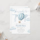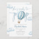 Esta encantadora invitación a la ducha de bebé incluye un bonito globo de aire caliente azul y nubes, junto con una elegante tipografía de guiones. Con el código QR del Registro y los detalles del evento al revés. Diseñado por Thisisnotme©
