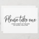 Un elegante letrero de regalos de boda con letra a mano que dice "Por favor, tome uno"
