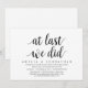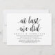 Tarjeta de invitación de boda con tema de escritura moderna (Por fin, lo hicimos). Es perfecta para su cena de fuga de novios informal junto al lago, baile y fiesta.