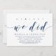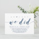 Moderna tarjeta de invitación de boda fugada con tema azul marino clásico y letra script (Por Fin, Lo Hicimos). Es perfecta para su celebración informal de boda fugada junto al lago.