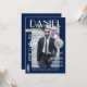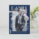 ¡Hazle el titular del día con esta moderna invitación de cumpleaños al estilo de portada de una revista en azul marino y plata! Diseñado tanto para hombres como para mujeres, este diseño de retrato incluye espacio para una foto personalizado, nombre, edad y texto audaz al estilo de titulares. Perfecto para cumpleaños de hito o celebraciones elegantes. Nota: Los colores de fondo y los elementos se pueden personalizar para que coincidan con el tema fiesta.