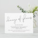 Posponer un gran evento como el de su boda puede ser estresante, pero todavía puede lucir elegante con esta moderna y minimalista tarjeta de plantilla de cambio de planes. Dice "cambio de planes" en texto manuscrito con letras en la parte superior seguido de su información y arrepentimientos sobre el evento.