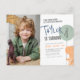 Una encantadora invitación para una fiesta de cumpleaños con un dinosaurio dibujado a mano sosteniendo un globo. Dentro del globo está la edad del niño de cumpleaños. El texto de la invitación se rota y se alinea a la izquierda para una disposición divertida. En la parte superior de la invitación se lee "Stomp, chomp & roar. ¡Seamos fiestas como un dinosaurio!". Debajo, el nombre de tu pequeña está escrito en un tipo de letra tipo escritura a mano. La información del fiesta se escribe en la parte inferior con espacio adicional para un mensaje de personalizado. En el lado izquierdo de la tarjeta, hay una foto de tu elección. Dividiendo la foto y el diseño, hay una línea blanca cepillada. Las tarjetas cambian a una disposición simple de postal con un fondo azul pastel. Nos encantan las invitaciones de postales ya que son una opción económica, tienen espacio para un mensaje escrito a mano, ¡y ahorran al comprar sobres! La paleta de colores de este diseño es azul, naranja y verde. ¡Perfecto para cualquier niño de edad! Coloridas invitaciones de postales de cumpleaños con temática de dinosaurios. Una versión de invitación estándar de este diseño está disponible en mi tienda. Por favor, tenga en cuenta que como se trata de una postal de invitación, no viene con sobres. Siéntete libre de enviarme cualquier pregunta - ¡estaré encantado de ayudar!
