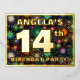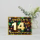 La parte delantera de este divertido diseño de postales de invitación a Relieves metalizados por 14 años de fiesta de cumpleaños incluye un nombre editable, un gran número "14", el mensaje "¡FIESTA DE CUMPLEAÑOS!" y un borde. El fondo del frente presenta un emocionante patrón multicolor inspirado en fuegos artificiales de celebración reventando. En la parte posterior se incluyen detalles personalizados sobre el evento, como la fecha, la hora, la ubicación/lugar y cualquier otra información que pueda ser importante. Invitaciones personalizadas como estas pueden ser una manera divertida de hacer saber a los asistentes/invitados acerca de una reunión/fiesta de cumpleaños que se realiza para celebrar el 14 cumpleaños de alguien. [~Z0000609]