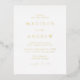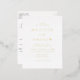 Postal minimalista y moderna de invitación a la boda con los detalles de su boda en letras de Relieve metalizado dorado con acentos caligráficos. El fondo blanco puede cambiarse a un color de su elección. La parte posterior de la postal de invitación a la boda del Relieve metalizado muestra la dirección de devolución y los detalles de RSVP. Diseñado para coordinar con nuestra colección de bodas Modern Elegance.