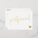 Dígale a sus invitados que el boda ha sido pospuesto y denles una nueva fecha o el enlace a su sitio web para más información con esta postal dorada y blanca que presenta un diseño tipográfico minimalista donde pospuesto se escribe a través del cambio la postal de fecha en un encantador guión de escritura a mano junto con un corazón de Relieve metalizado dorado. En el otro lado se puede escribir la nueva información y, debajo de un pequeño corazón, los nombres en una fuente moderna y limpia.