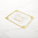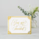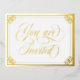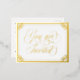 Invitación a la boda con postales de Relieve metalizado dorado con Usted es invitado en un guión dorado y rápido dentro de un marco ornamentado de Relieve metalizado dorado. Añade tu frase de invitación a la boda al otro lado. Invitación a la boda con postal dorada y blanca con elegantes detalles de Relieve metalizado dorado.