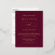 Postal de invitación de boda simple y elegante con nombres y detalles bodas mostrados en letras de Relieve metalizado dorado con acentos caligráficos en un fondo burdeos. La parte posterior de la tarjeta postal de invitación a la boda de Relieve metalizado dorado muestra su dirección de retorno, los detalles de RSVP y el sitio web del boda. El diseño se coordina con nuestra colección de bodas Amados.