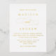 Postal de invitación de boda simple y elegante con nombres y detalles de boda mostrados en letras de Relieve metalizado dorado con acentos de escritura caligráfica. La parte posterior de la tarjeta postal de invitación a la boda de Relieve metalizado dorado muestra su dirección de retorno, los detalles de RSVP y el sitio web del boda. El diseño se coordina con nuestra colección de bodas Amados.