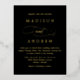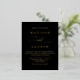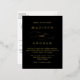 Postal de invitación de boda simple y elegante con nombres y detalles bodas mostrados en letras de Relieve metalizado dorado con acentos caligráficos en fondo negro. La parte posterior de la tarjeta postal de invitación a la boda de Relieve metalizado dorado muestra su dirección de retorno, los detalles de RSVP y el sitio web del boda. El diseño se coordina con nuestra colección de bodas Amados.