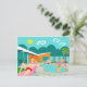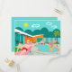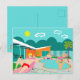 Esta postal retro Fiesta de la piscina gay cuenta con cuatro insignes bizcochos que pasan un buen rato gay al vencer el calor de Palm Springs relajándose alrededor del agua azul turquesa de su piscina atómica en forma de boomerang. La arquitectura moderna de mediados de siglo, en la fabulosa casa de piedra naranja, es claramente un establecimiento inmueble privilegiado, dadas las vistas a las montañas en el fondo. Un sol estelar amarillo brilla con fuerza en el cielo turquesa para que puedas ver todos los detalles encantadores, desde los flamencos rosados y kitschy hasta la cerca de bloques de rayas y brisas de los años 50. Y por supuesto, ¿qué mansión de Palm Springs estaría completa sin una palmera?