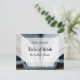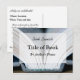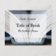Una fotografía de la columna vertebral de un libro sirve como fondo para esta postal de lanzamiento del libro.