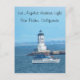 Faro al final del rompeolas, pequeño barco de crucero del puerto en primer plano. El edificio es blanco con líneas verticales y superior en negro. Luz del puerto de Los Ángeles, también conocida como Angels Gate Light, Desglose de San Pedro en el puerto de Los Ángeles, California. Construido en 1913. El texto en la parte delantera dice "El puerto de Los Ángeles enciende a San Pedro, California". La información de la parte posterior muestra nombres alternativos y fecha de generación.
