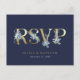 Postal RSVP de boda imprimida por un personalizado asequible con tipografía de Relieve metalizado de oro fino y delicados florales de acuarela en suaves colores azul y verde. Personaliza el diseño con la información de tu boda RSVP y las opciones de comida para los huéspedes. Utilice las herramientas de diseño para personalizar del texto, elija cualquier color de fondo y edite las fuentes y colores para crear su propio diseño único de tarjeta de respuesta boda. Este precioso diseño dorado y floral es perfecto para cualquier temporada.